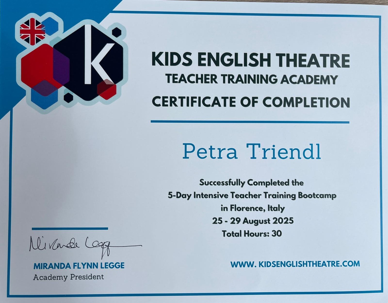 Um mich kontinuierlich weiterzubilden und meine Arbeit als Englischtrainerin für Kinder noch wertvoller zu machen, habe ich im August 2025 ein intensives 5-tägiges Teacher Training an der Kids English Theatre Academy in Florenz absolviert.
